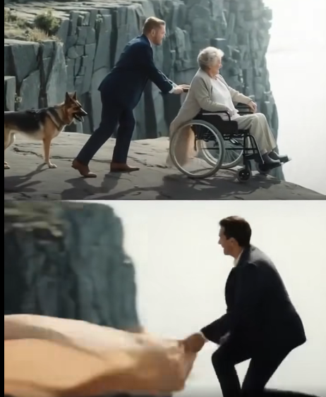 At the cliff’s edge, the young man leaned close, lips brushing her ear. He whispered something cruel, words only she would ever hear, before shoving hard. The wheelchair rolled forward. The old woman’s scream cut through the valley, sharp, raw, then silenced by the rush of wind and the roar of the river far below.